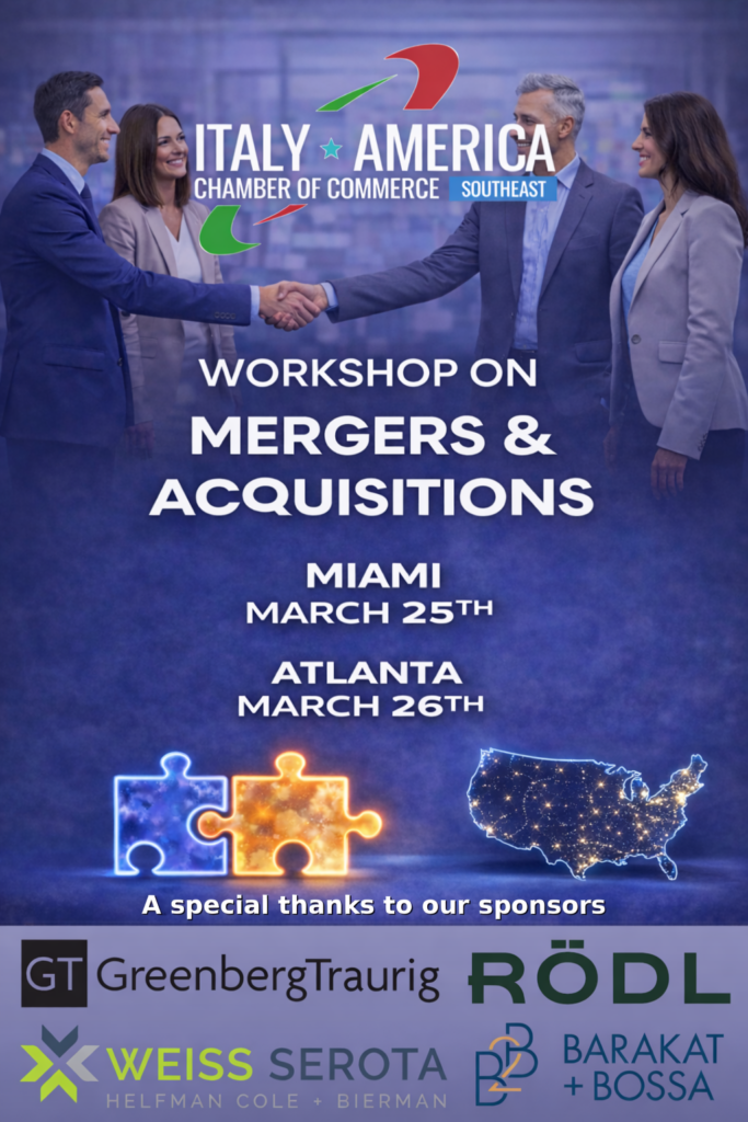 The Italy-America Chamber of Commerce Southeast (IACCSE) invites all its members to participate in our upcoming M&A Workshop in Miami and Atlanta, designed for executives, CFOs, and legal and finance leaders navigating cross-border transactions between Italy and the United States.